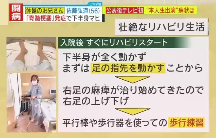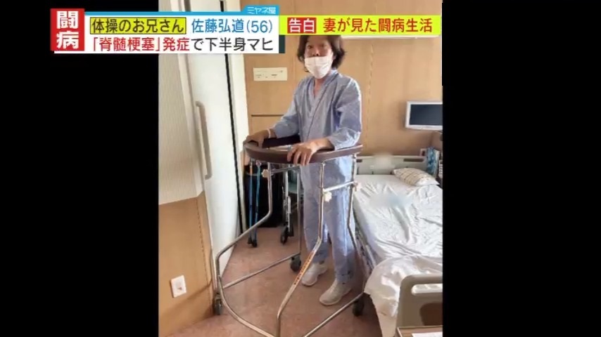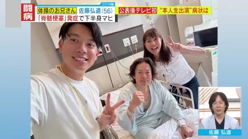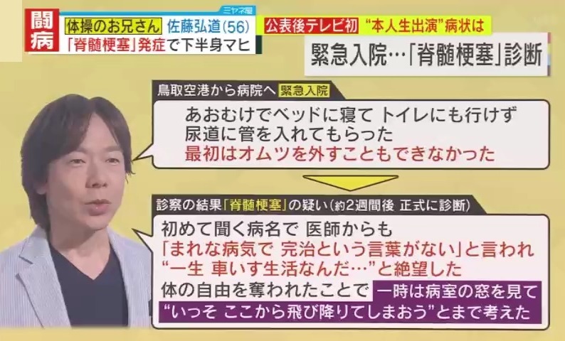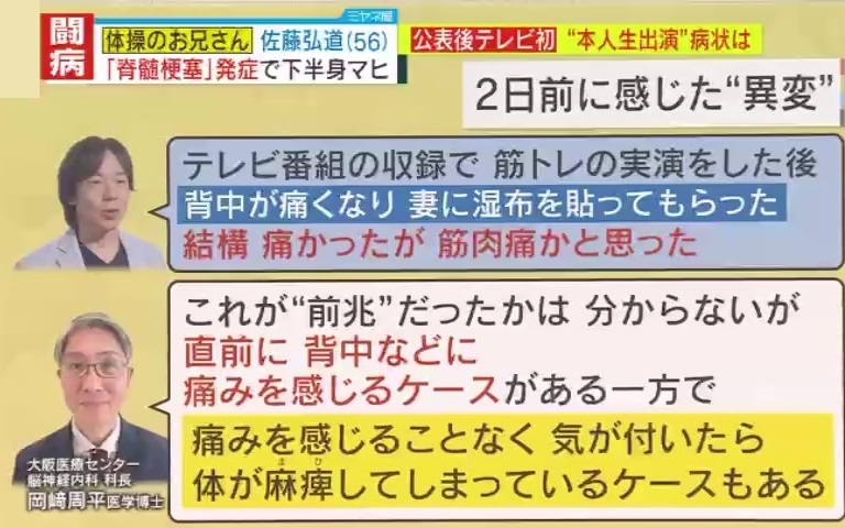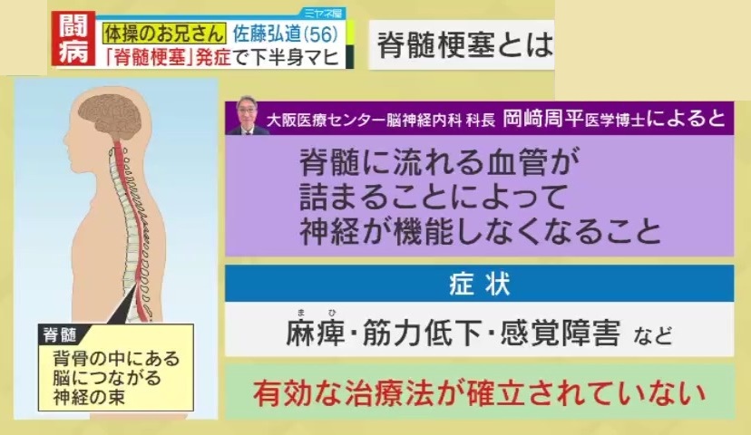 大阪医療センター脳神経内科 科長・岡﨑周平医学博士によると、佐藤さんが発症した『脊髄梗塞』とは、脊髄に流れる血管が詰まることで神経が機能しなくなる病です。麻痺・筋力低下・感覚障害などの症状を引き起こしますが、今現在も有効な治療法が確立されていません。