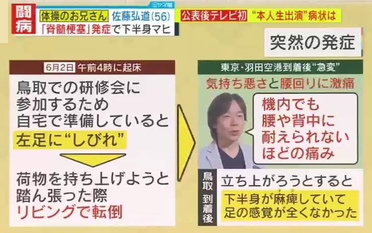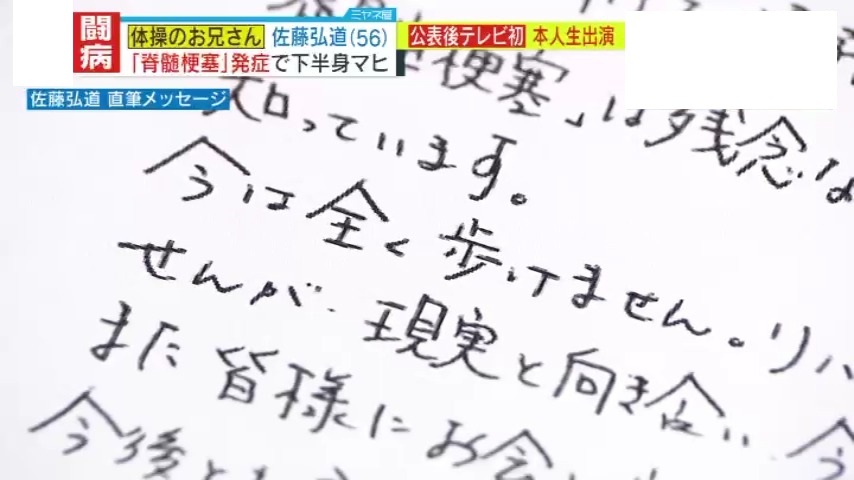 2024年6月13日、佐藤弘道さんは直筆のメッセージで『脊髄梗塞』を公表しました。