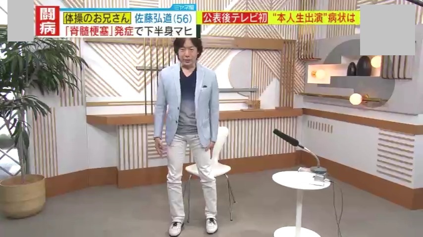 入院する2日前に異変を感じていたと言う佐藤さん。「テレビ番組の収録で筋トレの実演をした後、背中が痛くなり、妻に湿布を貼ってもらった。結構痛かったが、筋肉痛かと思った」と振り返ります。