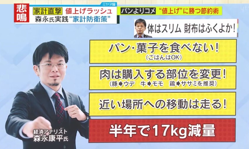 森永さんは「体をスリムにすれば、財布はふくよかになる」と言い、具体的には、パン・お菓子を食べない、肉は購入する部位を豚ならウデ、牛はモモ、鶏はササミに変更しました。さらに、近い場所への移動は走る、ということを実践したところ、半年で17kg減量したということです。