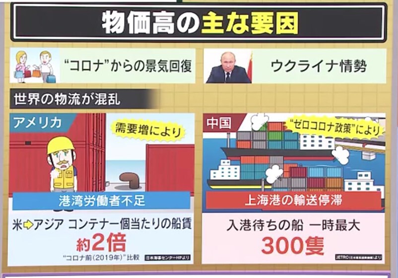 この物価高を引き起こしている大きな要因は、コロナからの景気回復で需要が増えたこと、またウクライナ情勢も影響を与えています。世界の物流が混乱しており、アメリカでは需要が増えたことによって港湾労働者が不足し、アメリカからアジア向けのコンテナ1個当たりの船賃が、コロナ前と比べて約2倍になりました。また中国では、「ゼロコロナ政策」によって上海港の輸送が停滞。入港待ちの船が、一時最大で300隻にも上ったということです。