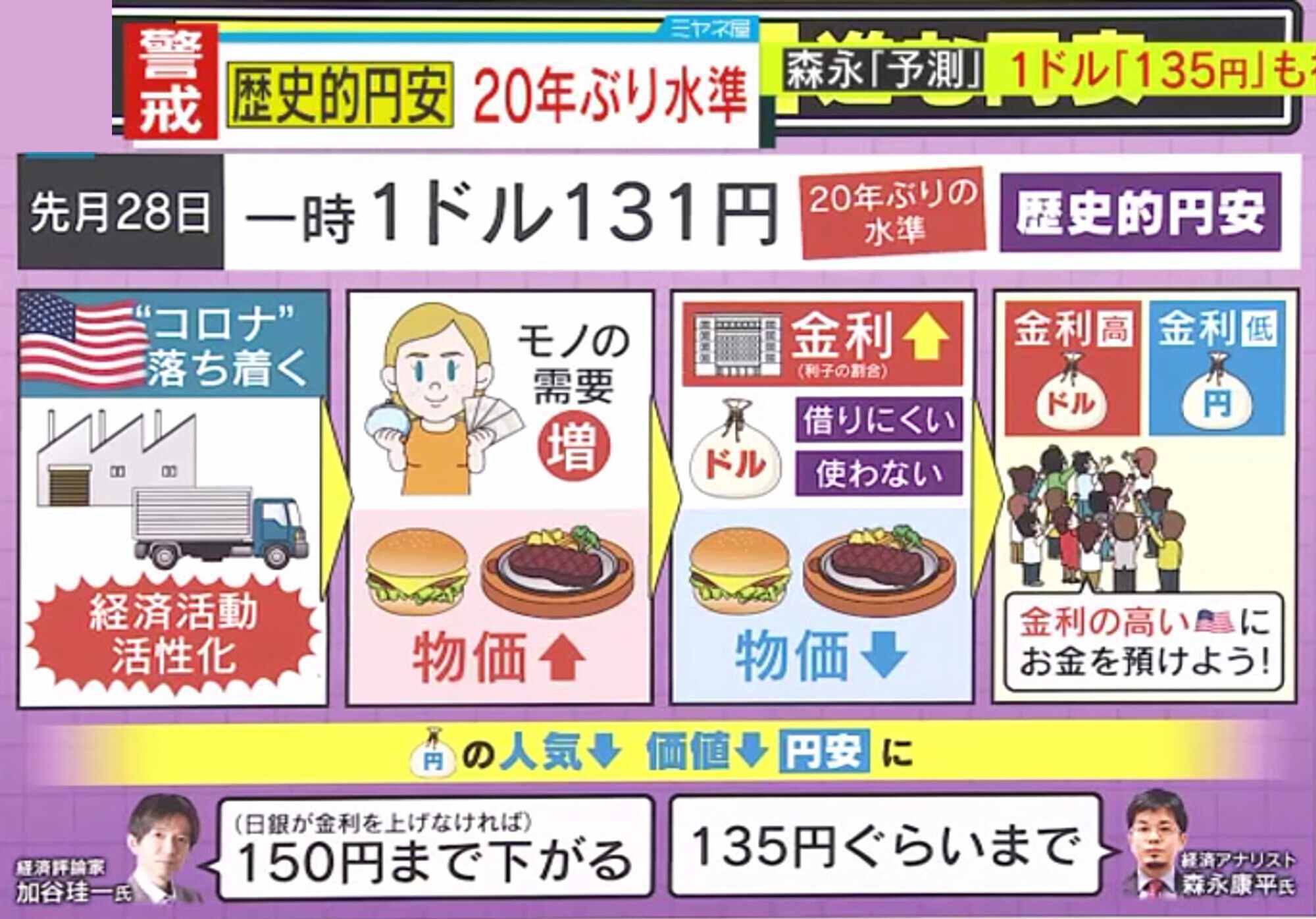 4月28日、一時1ドル131円という歴史的な円安となりました。なぜ円安が進んだのかというと、まずアメリカで新型コロナが落ち着いたことによって、経済活動が活性化しました。するとモノの需要が増え、物価が上がりました。アメリカ政府は物価を安定させるために、利子の割合である「金利」を上げました。これによって企業はお金を借りにくくなり、お金が回らなくなると物価を下げようと試みました。これによって、ドルと円の金利差が大きくなってしまったのです。金利の高いアメリカにお金を預けようという動きが加速し、円の価値が下がって円安が進んだということです。経済評論家の加谷珪一さんによると、「日銀が金利を上げなければ、1ドル150円まで下がるのではないか」ということです。