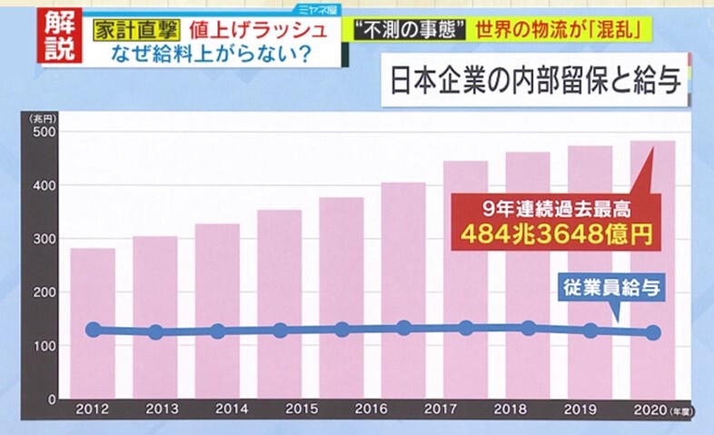 日本企業の内部留保と給与を比較して見ると、内部留保が9年連続で過去最高を更新している一方で、青いグラフの従業員の給与は横ばいのままとなっています。