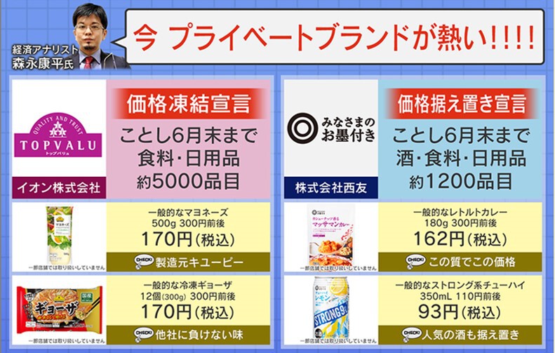 物価高を乗り切る“家計お助け術”として、企業の「プライベートブランド」の活用があります。森永さんが「激熱」と言うのは、イオン株式会社の「トップバリュ」。6月末まで“価格凍結宣言”をしました。約5000品目の価格を据え置くということで、例えば一般的なマヨネーズは500g・300円前後のところ、税込み170円に価格据え置きということです。また、株式会社西友の「みなさまのお墨付き」というプライベートブランドも、価格据え置き宣言をしています。