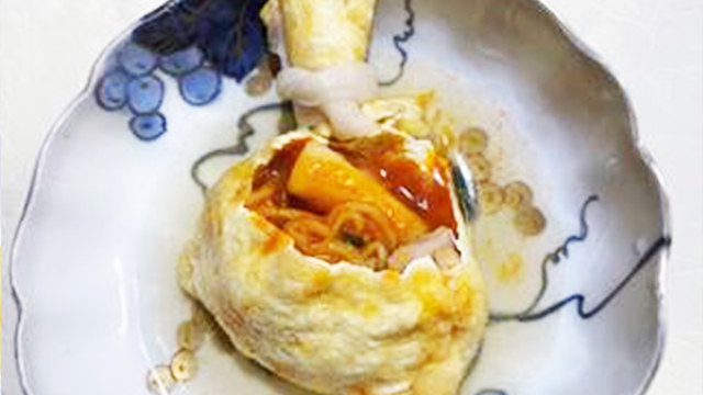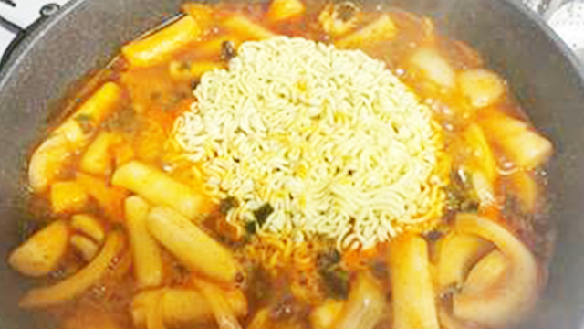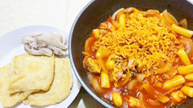 *トッポッキとラーメンを組み合わせた韓国屋台のB級グルメ、市販のものをそのまま袋の表示に合わせて作り使用*