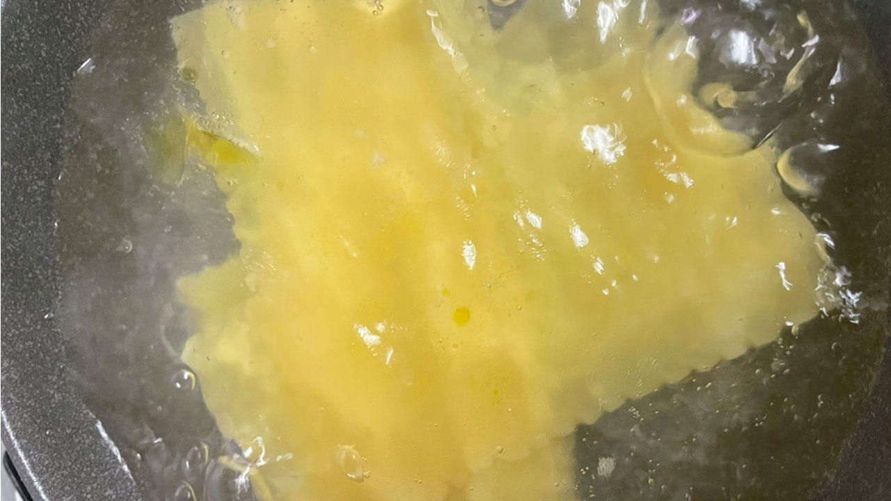 ③ 耐熱容器に、ホワイトソース、ゆで卵のみじん切り、ラザニア、ミートソース、ピザ用チーズを2回~3回重ねて、250度で15~20分焼き上げる。