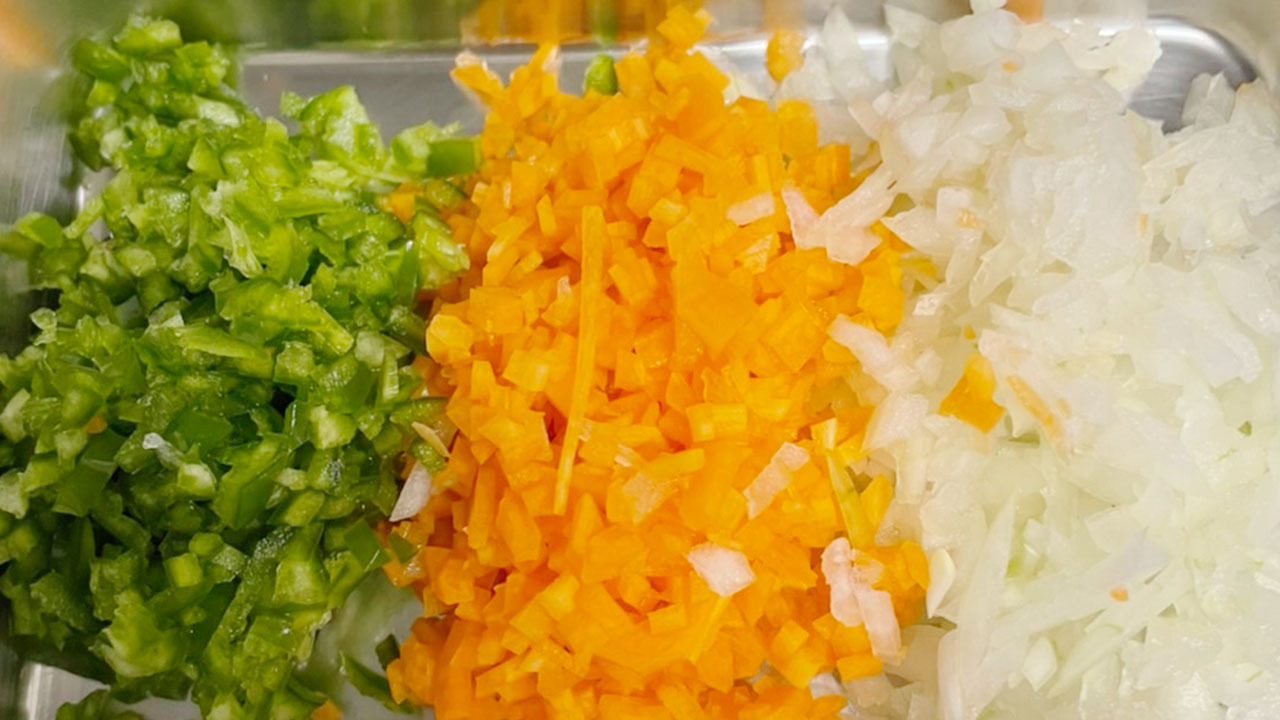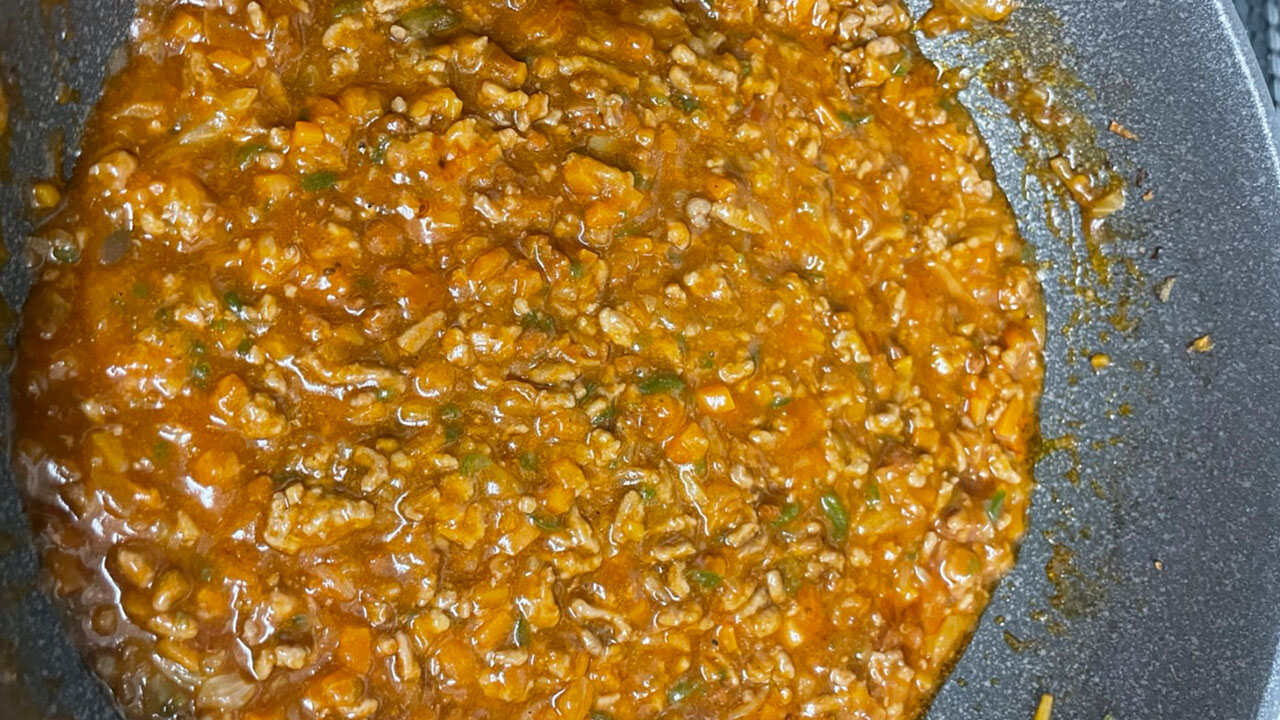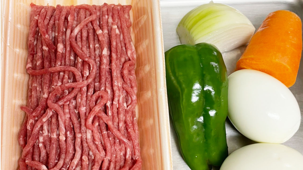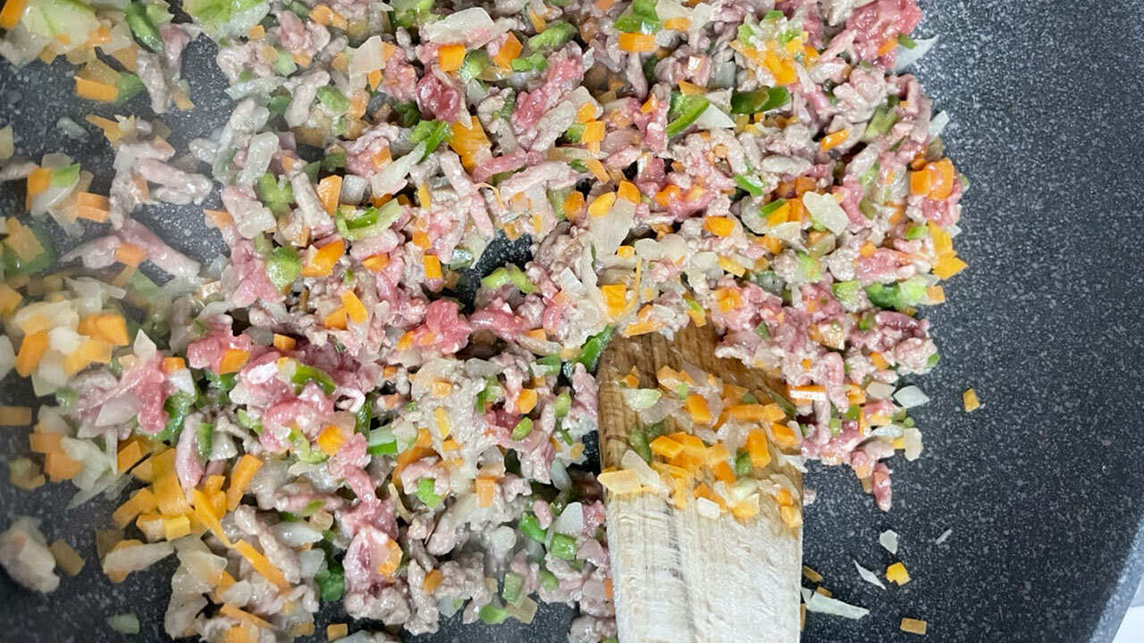 ① 玉ねぎ、人参、ピーマンをみじん切りにし、バターでよく炒め、合い挽き肉を入れて火が通ったら、ワイン、ミートソース缶をいれる。