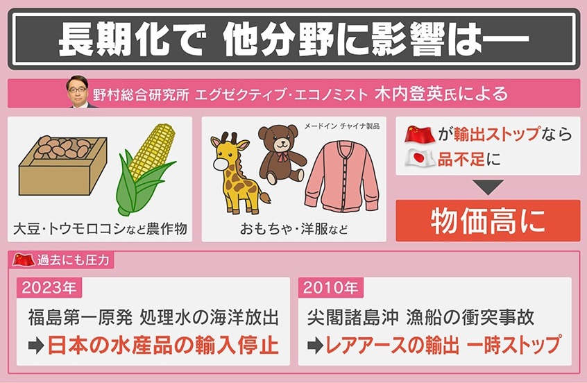 また木内氏は、大豆・トウモロコシなどの農作物や、おもちゃ・洋服などの『メードインチャイナ製品』の輸出を中国がストップした場合、日本で品不足になり物価高につながる恐れがあるといいます。