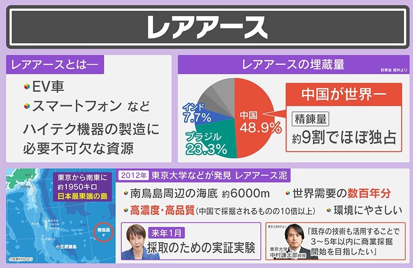 一方、日本でも2012年に東京大学などが『レアアース泥(でい)』を発見しました。日本最東端の島・南鳥島周辺の海底約6000メートルに世界需要の数百年分のレアアース泥があり、高濃度・高品質(中国で採掘されるものの10倍以上)で、環境にやさしいものだということです。高市首相は2026年1月、採取のための実証実験を行うとしていて、東京大学・中村謙太郎教授は「既存の技術も活用することで、3~5年以内に商業採掘開始を目指したい」と話しています。