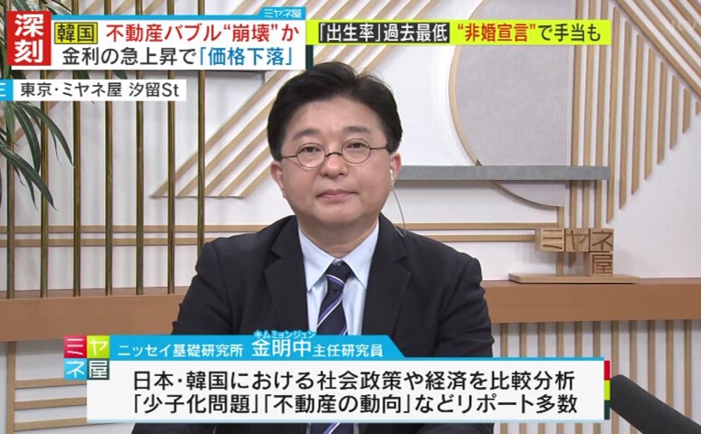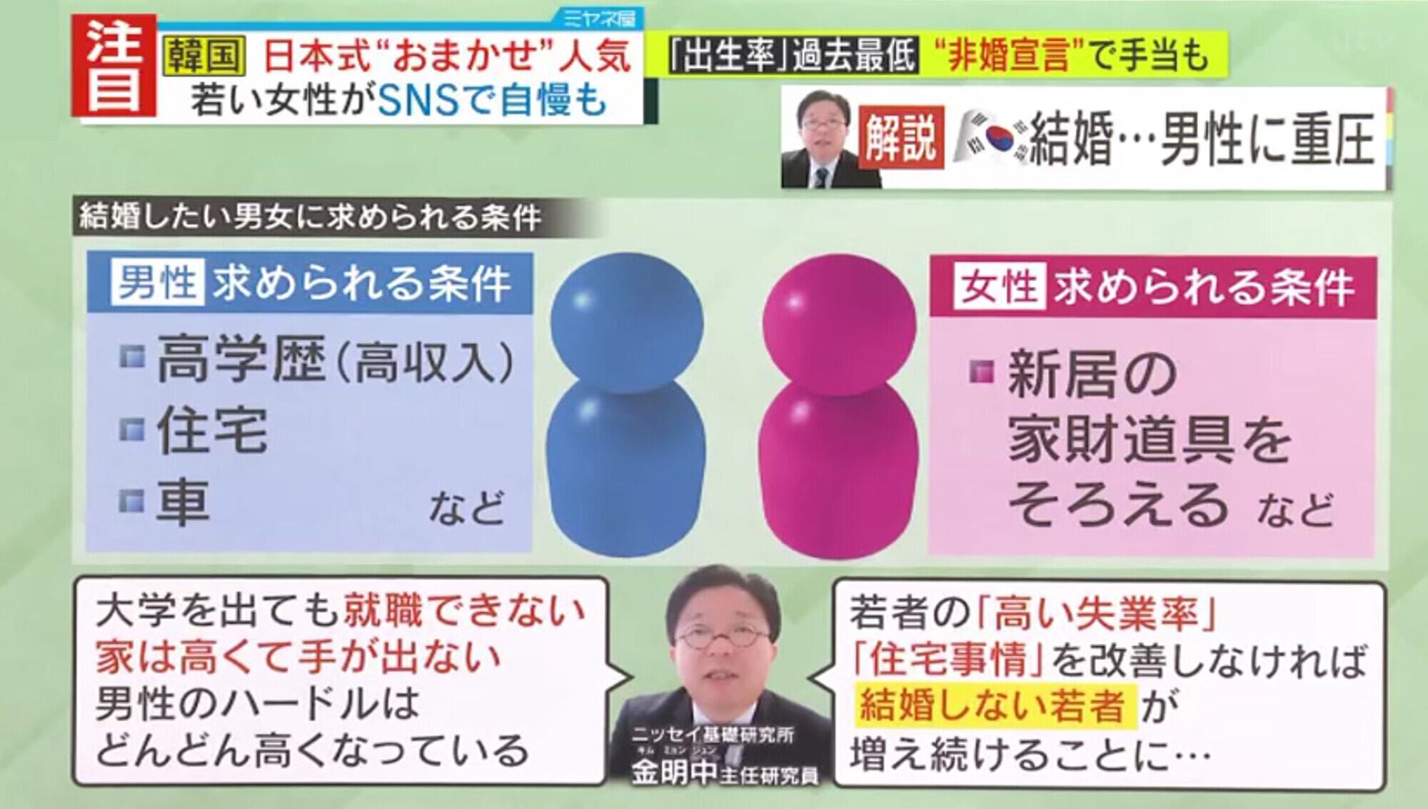 韓国で結婚したい女性に求められる条件は、「新居の家財道具をそろえる」などの一方、男性は「高学歴(高収入)・住宅・車」などといわれています。金主任研究員は「大学を出ても就職できない。家は高くて手が出ない。男性のハードルはどんどん高くなっている。若者の高い失業率・住宅事情を改善しなければ、結婚しない若者が増え続けることに…」と話します。