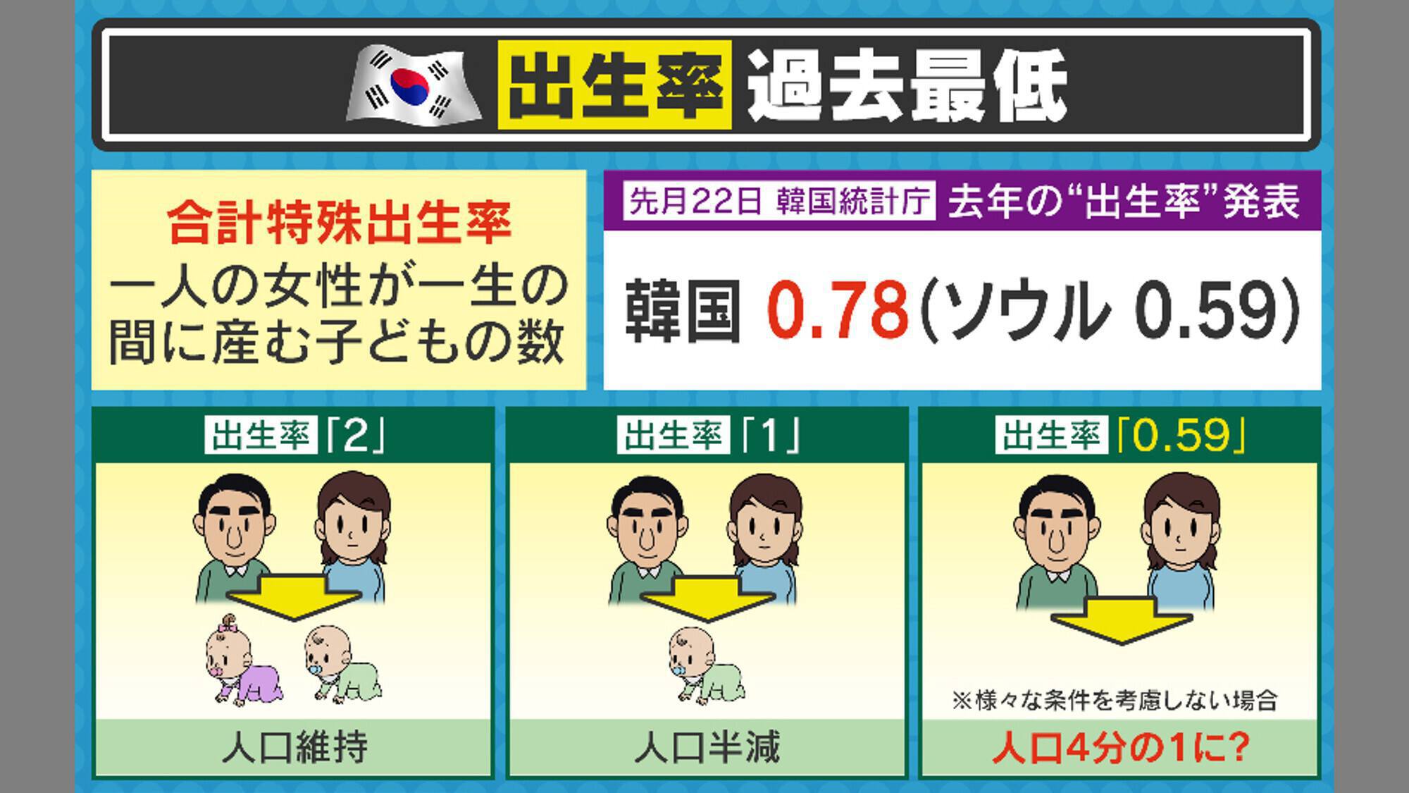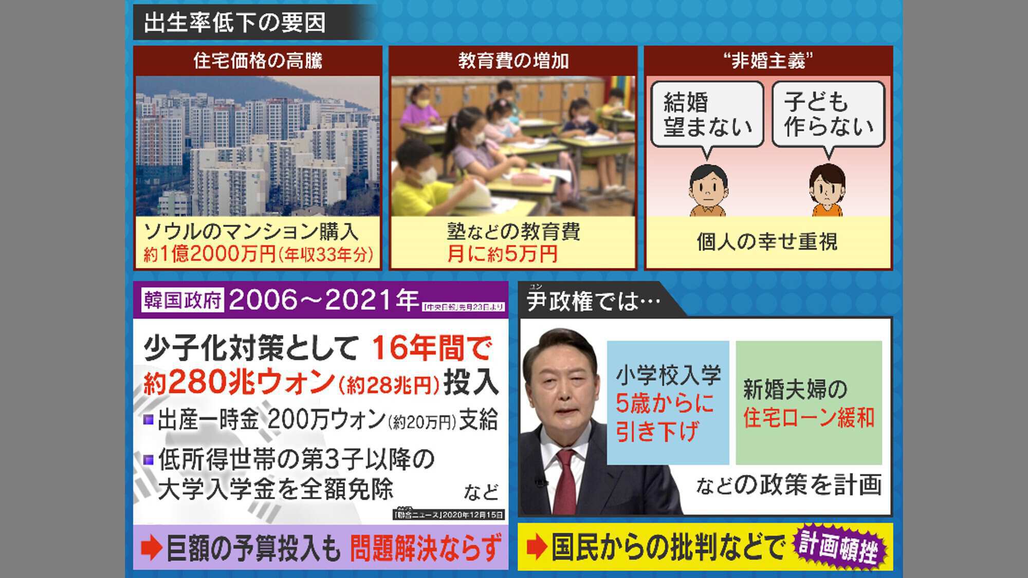 一方、韓国で大きな課題となっているもう一つの問題が“少子化”です。韓国国内の新聞には「韓国が消えていく」「国家消滅に危機」といった文言が大きく載りました。これらは過去最低となった出生率を危惧した記事の見出しです。2月22日に韓国統計庁が発表した、1人の女性が一生の間に産む子どもの数=合計特殊出生率は、2022年は、韓国全体で0.78となり、ソウルに限ると0.59でした。出生率0.59では、単純計算で将来の人口が4分の1になるとみられます。このような出生率低下の要因として、住宅価格の高騰、教育費の増加、個人の幸せを重視する“非婚主義”などが挙げられます。