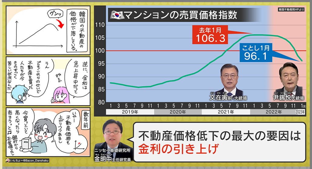 しかしその家を用意するにも、いんちょーさんによると、今韓国の不動産価格は下落していますが金利は急上昇中で、不動産を買った人達は苦しい状況に陥っているということです。韓国のマンションの売買価格指数は、文在寅政権下だった、2021年6月を100とすると、2022年1月には106.3と上昇を続けていましたが、尹錫悦政権になってからは下落し、2023年1月には96.1となっています。金主任研究員は「不動産価格低下の最大の要因は、金利の引き上げ」としています。