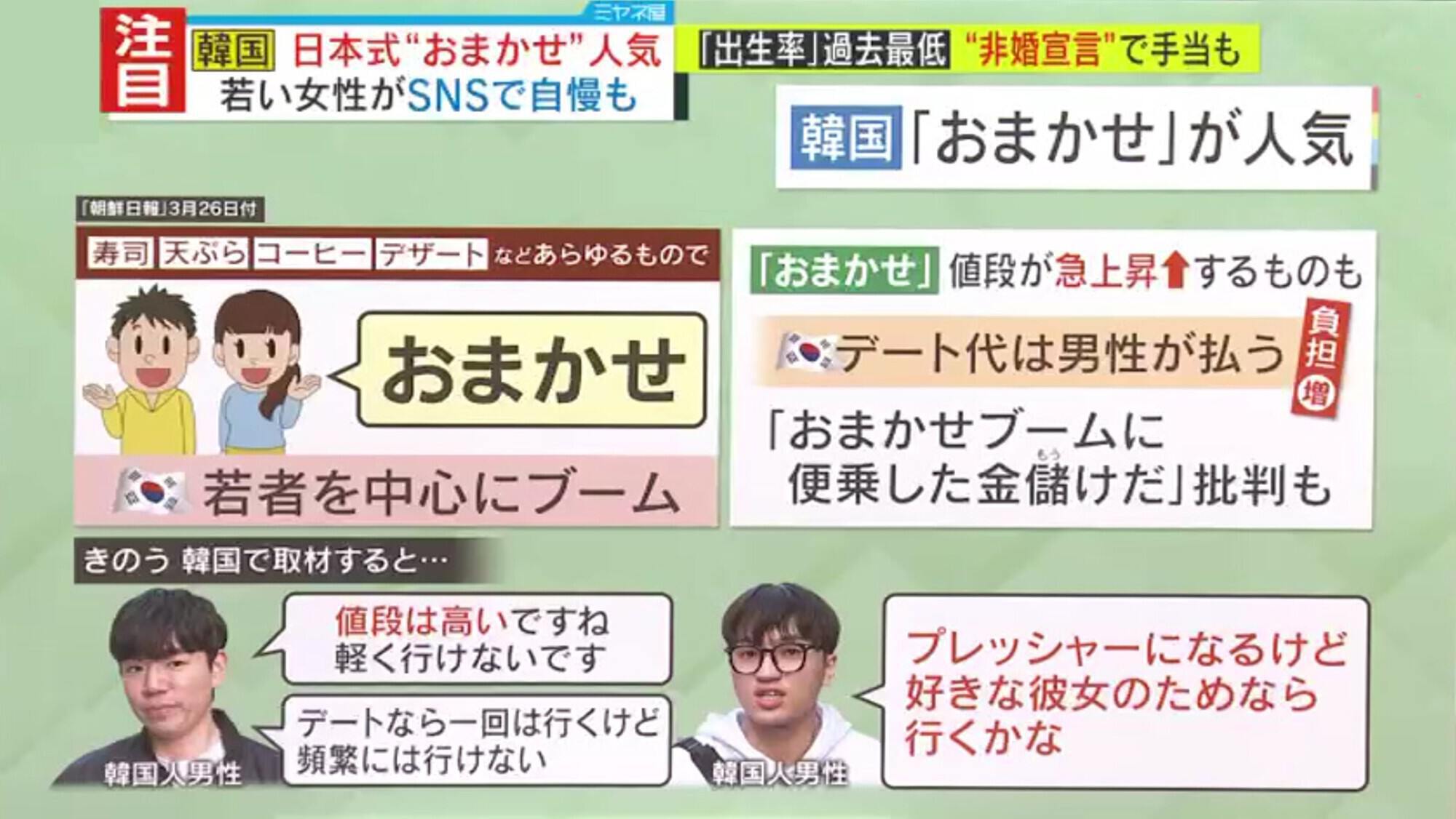韓国在住の日本人ブロガーでイラストレーターのいんちょーさんによると、韓国では今、日本の料理店ではお馴染みの注文スタイル「おまかせ」が大人気で、デートで「おまかせ」のある料理店に行くと、女性は大満足ですが、食事代を払う男性のサイフは大ピンチ、ということがよくある光景だということです。韓国では“デート代は男性が払うもの”という価値観が根強く、「おまかせ」は値段が急上昇するものもあることから、「おまかせブームに便乗した金儲けだ」という批判も出ています。