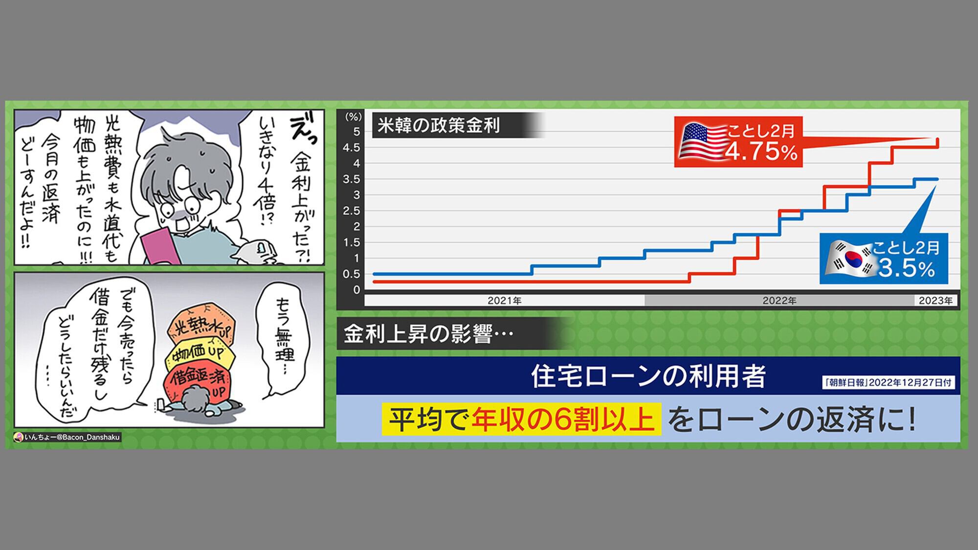2022年12月27日付けの「朝鮮日報」は、金利上昇の影響で、住宅ローンの利用者は平均で年収の6割以上をローン返済に充てていると報道しています。さらに、韓国も日本と同じ物価高で、光熱費や水道代も値上がりしているということです。生活は火の車ですが、手持ちの不動産を売っても残るのは借金だけという、厳しい現実に直面しています。