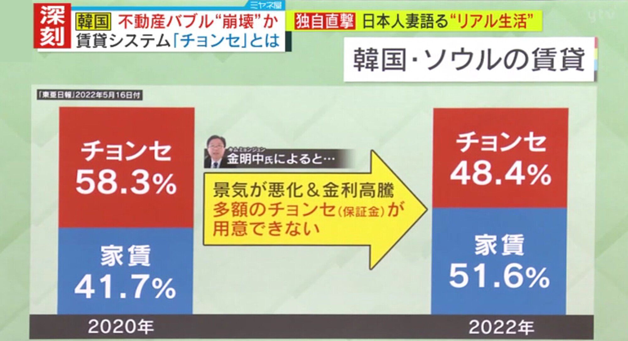 借主からすれば、実質“家賃ゼロ”で住まいを借りられる一見便利な制度ですが、金主任研究員によると、「チョンセを利用する人は減ってきている」ということです。韓国にはチョンセ制度と共に家賃制度もあり、2020年まではチョンセを利用する人が約6割、家賃を利用する人は約4割でしたが、景気が悪化し金利が高騰しているため、多額の保証金が用意できないケースが増え、2022年にはチョンセが約5割、家賃も約5割とほぼ同じになっています。