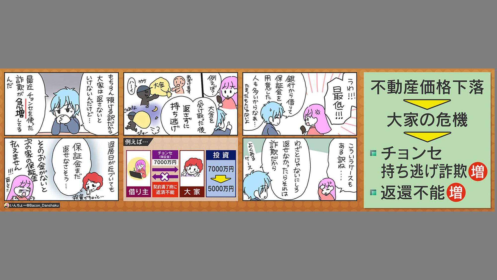 さらに、いんちょーさんによると、大家が大金を受け取った後にチョンセを返さず持ち逃げする「チョンセ詐欺」が急増しているということです。また、大家の投資失敗による返還不能も増加しています。