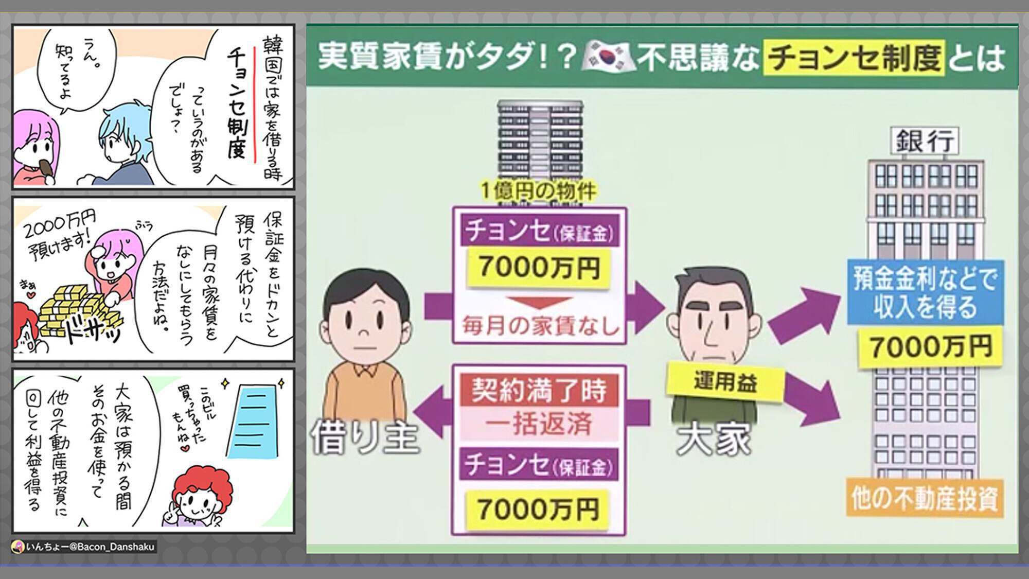 韓国特有の賃貸制度に「チョンセ」というシステムがあります。不動産価格の5割~7割ほどの保証金を一括で大家に預けることで、毎月の家賃が免除される賃貸システムです。賃貸期間が終わると、預けた保証金は全額、借主へ返金されます。一方の大家は、家賃収入の代わりに、預かった保証金を銀行に預けて金利を得たり、投資にあてるなどして、運用益を得る仕組みです。多くの借主は、高額な保証金を銀行などから借り入れして支払っているということです。