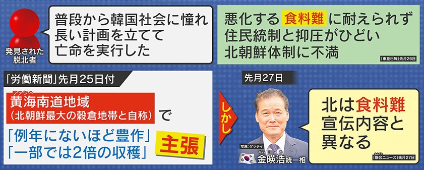 発見された脱北者は、脱北を決意した理由を「普段から韓国社会に憧れ、長い計画を立てて亡命を実行した」と語っています。また、悪化する食糧難に耐えられなかったということです。しかし、10月25日の北朝鮮「労働新聞」によると、「黄海南道地域で例年にないほど豊作」「一部では2倍の収穫がある」と主張しています。これに対し、韓国側は「北は食糧難、宣伝内容とは異なる」としています。