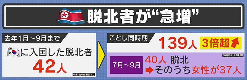 昨年同時期の3倍超…脱北者が急増