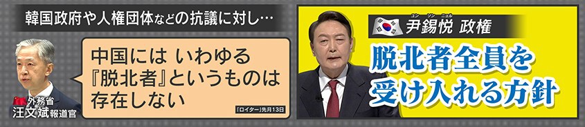 韓国政府や人権団体の抗議に対して、中国政府は「中国には、いわゆる『脱北者』というものは存在しない(不法に入国している)」と反論しています。一方で韓国尹政権は「脱北者全員を受け入れる方針」だということです。
