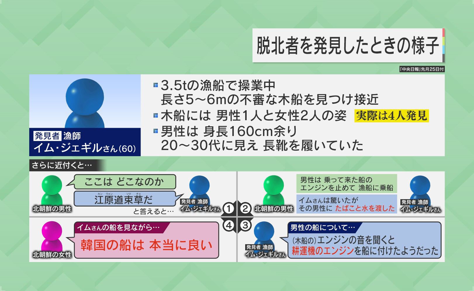 10月24日午前7時ごろ、操業中の3.5tの韓国漁船に乗っていた漁師のイムさんが長さ5~6mの不審な木造船を発見し、海洋警察に「おかしな船がいる」と通報しました。木船には男女4人が乗っていました。