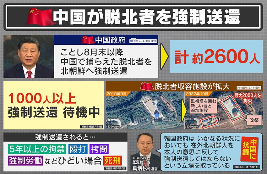 実は、“コロナ禍”において、北朝鮮は国境を封鎖していたため、脱北者の送還を拒否していました。そのため、中国にある脱北者の収容施設が拡大していきました。ここにきて、コロナが落ち着いたので中国は強制送還を行っているということです。