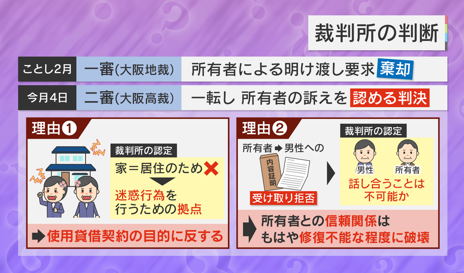 さらに高裁は、所有者である親族が、男性へ“内容証明”を送ったものの、男性が受け取り拒否したことから『男性と所有者が話し合うことは不可能であり、所有者との信頼関係はもはや修復不能な程度に破壊されている』との判断を示しました。