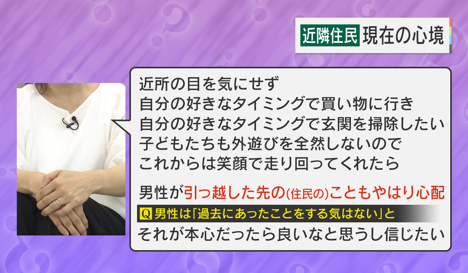 「近所の目を気にせず、自分の好きなタイミングで買い物に行き、自分の好きなタイミングで玄関を掃除したい。子どもたちも外遊びを全然しないので、これからは笑顔で走り回ってくれたら。男性が引っ越した先の(住民)こともやはり心配」