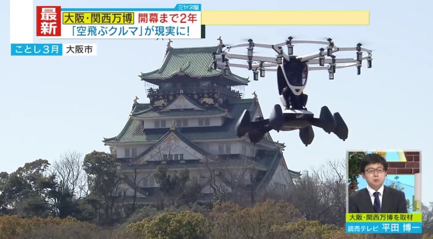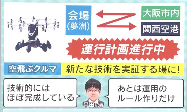 2つ目の注目ポイントは、この万博の目玉ともされる“空飛ぶクルマ”です。会場になる夢洲と大阪市内、または関西空港を結ぶ運行計画が進行中で、新たな技術を実証する場になると期待されています。平田記者によると、技術的にはほぼ完成していて、あとは運用のルール作りだけだといいます。