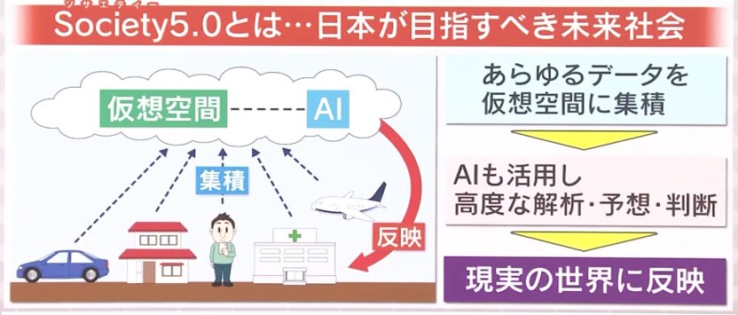 大阪・関西万博で注目したい4つのポイントを見ていきましょう。まずは、未来を実現するキーワード『Society5.0』。これは、あらゆるデータを仮想空間に集め、AIも活用しながら解析・予想・判断を行い現実世界に反映するという、“日本が目指すべき未来社会”だといいます。例えば、「スーパーコンピューター富岳」はコロナ禍で飛沫の飛散などをシミュレーションし、そのデータを“パーティション”や“換気”といった対策に活用しました。大阪・関西万博では、人の流れをAIなどでコントロールして会場内で快適な過ごし方を実現したり、世界中の人と会話できる多言語システムなどがあるといいます。