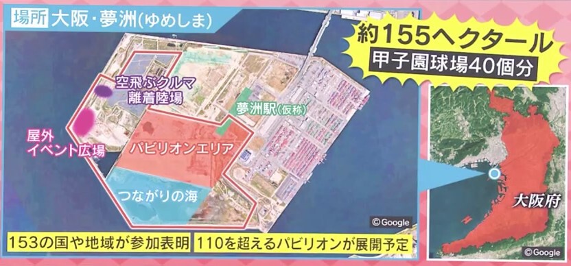 開催場所は、大阪の夢洲。島の約4割にあたる155ヘクタール、甲子園球場40個分の場所が会場になります。現在、153の国や地域が参加を表明しており、企業を含めると110を超えるパビリオンが展開予定だということです。