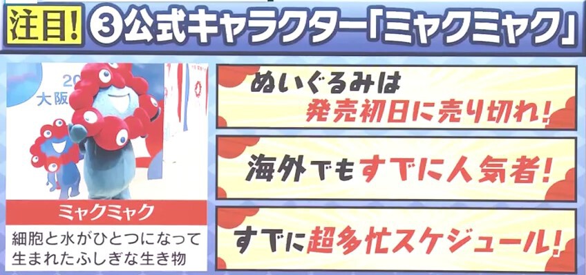 3つ目の注目ポイントは、細胞と水がひとつになって生まれたふしぎな生き物『ミャクミャク』です。ぬいぐるみは発売初日に売り切れ、海外でも大人気で、すでに超多忙スケジュールという人気ぶり。