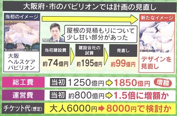また、大阪府・市のパビリオン「大阪ヘルスケアパビリオン」では、すでに計画が見直されました。建設費は当初74億円という試算でしたが、建設会社の試算では194億円となり、その後見直され99億円になるも、予算オーバーに。総工費も、当初は1250億円の予定でしたが1850億円に増額する見込みで、運営費も当初800億円の予定が1.5倍に増額かといわれています。それにより、当初6000円といわれていたチケット代が、8000円で検討されているとみられています。