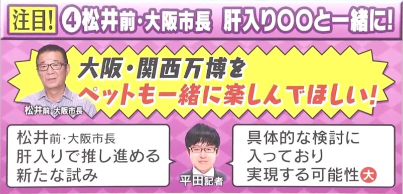 そして、4つ目の注目ポイントは、松井前大阪市長が肝いりで推し進める新たな試みです。それは、『ペットも一緒に万博を楽しめる』というもので、平田記者によると、すでに具体的な検討に入っており、実現する可能性も大きいということです。
