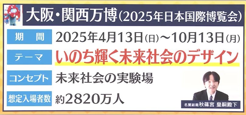 秋篠宮皇嗣殿下が名誉総裁を務められる大阪・関西万博は、2025年4月13日から10月13日にかけて開催されます。入場者数は、2410万人が入場した『ドバイ万博(2021年)』や2205万人が入場した『愛・地球博(2005年)』よりも多く想定され、2820万人を見込んでいます。