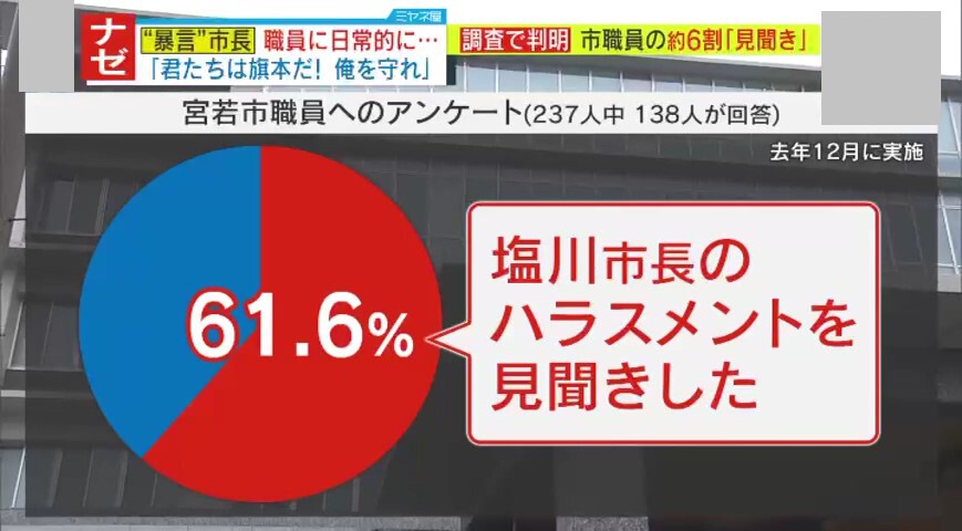 関係者によると、2023年12月に実施した宮若市職員へのアンケートで、回答者の60%以上が「塩川市長のハラスメントを見聞きした」と回答しました。アンケートには、「君たちは旗本だ、俺を守れ!」といった具体的な発言内容もあったといいます。