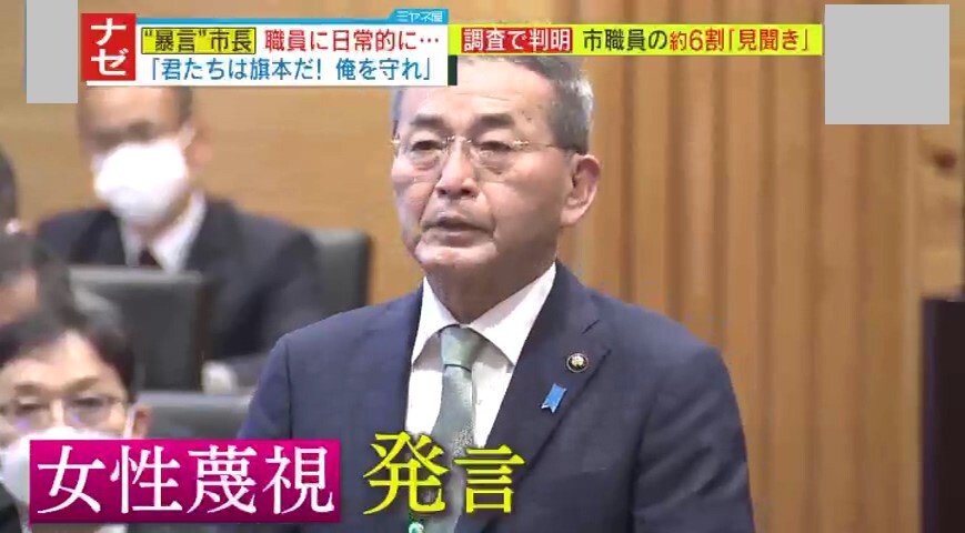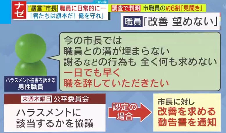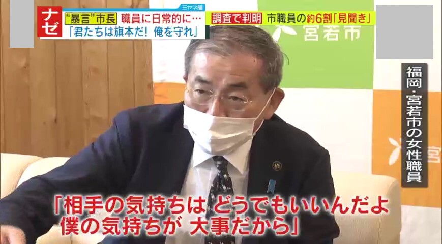 「市長室で業務の打ち合わせ中に、市長と1対1だったんですけど、『なんで女性がこの部署にいるのか、全く意味が分からない』『一掃して、男性だけの部署にする』というふうに言われました。『相手の気持ちは、どうでもいいんだよ。僕の気持ちが大事だから』と普段から言っています」