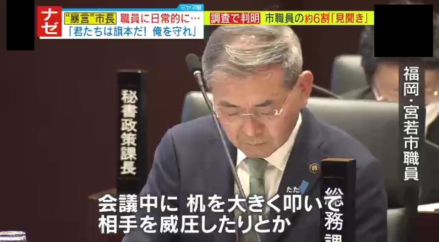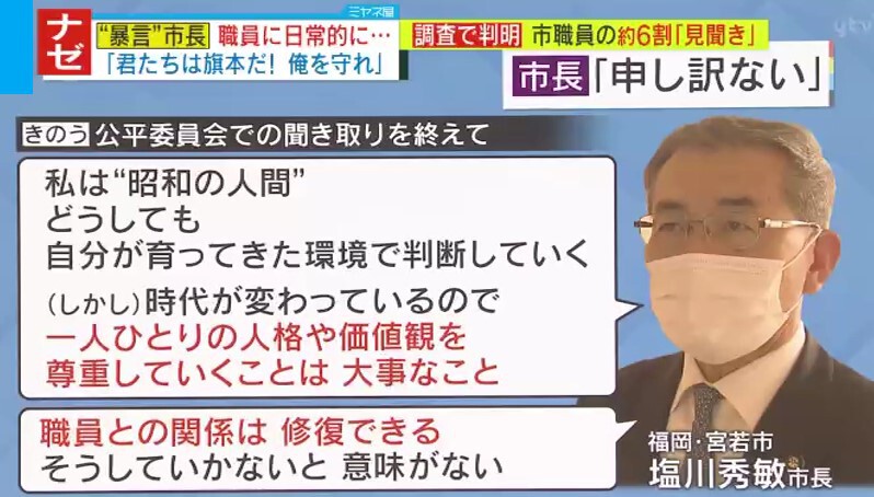 職員に対する数々の“ハラスメント言動”が問題視されている、福岡・宮若市の塩川秀敏市長(75)。日常的に机を叩いて威圧したり、「女性は3人目からが本当の子育て」「女を一掃して男だけの部署に」といった女性蔑視とも取れる発言など、職員から数々の証言が上がる中、市の公平委員会での聞き取りが行われました。その後の塩川市長のコメントにも波紋が広がっています。