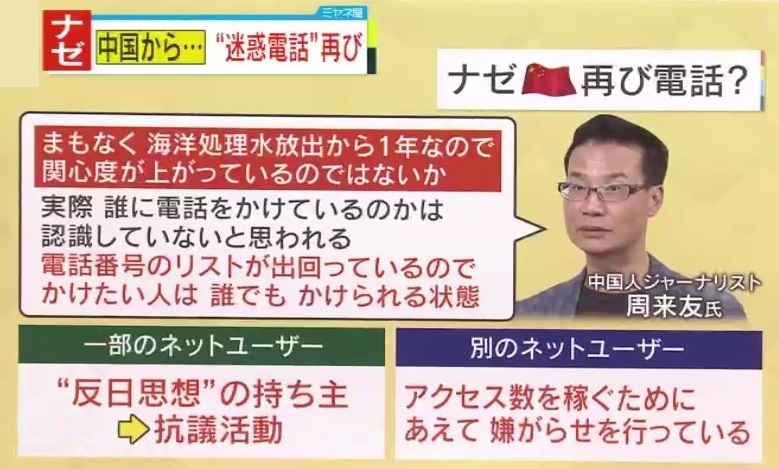 なぜ今、迷惑電話は再開されたのでしょうか?中国人ジャーナリスト・周来友氏によると、「まもなく処理水放出から1年なので、関心度が上がっているのではないか」といいます。また、一部のネットユーザーは“反日思想”の持ち主として抗議活動のために行っていますが、周氏は「実際、誰に電話をかけているのかは認識していないと思われる。電話番号のリストが出回っているので、かけたい人は誰でもかけられる状態だ」と指摘。ネットユーザーの中には、アクセス数を稼ぐために、あえて嫌がらせを行っている人もいるということです。