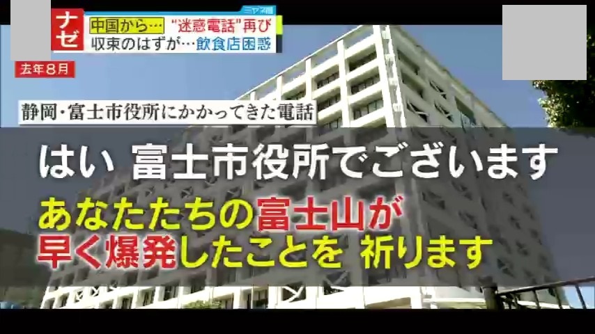 2023年8月、千葉県内のホテル・大阪市内のカフェ・新潟市内の食堂・静岡県内の役所・福島市内のラーメン店など、全国各地で相次いだ国番号『86』からの迷惑電話。福島市内の市役所・学校・公共施設などにかかってきた中国からの迷惑電話は、2023年8月24日~31日の1週間だけで2037件あったといいます。