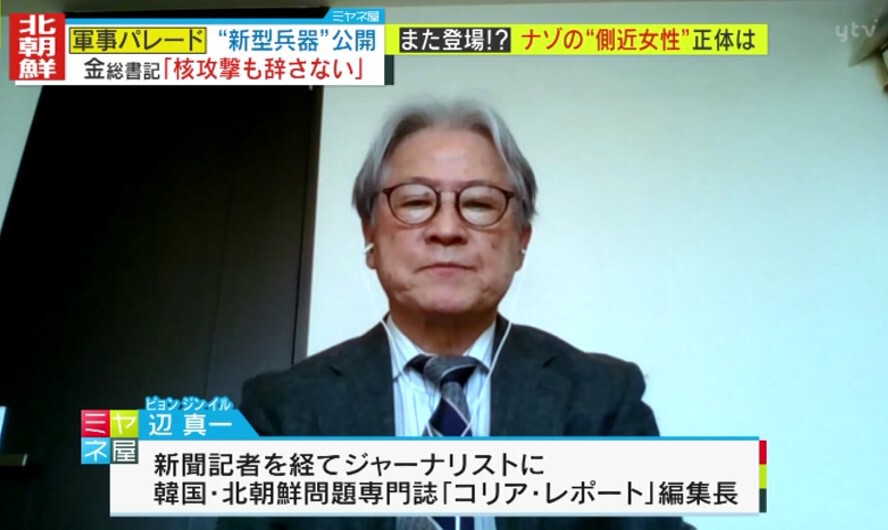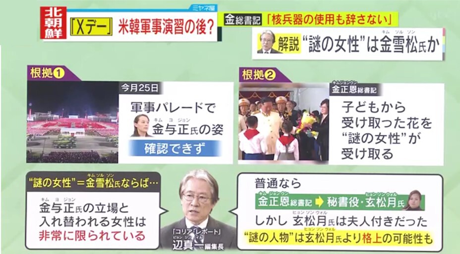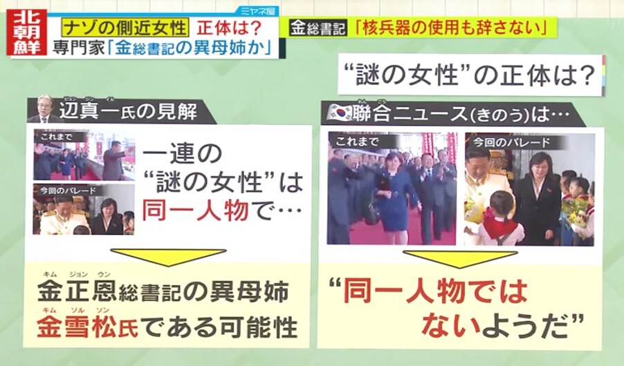さらに辺編集長が注目したポイントは、金正恩総書記の側にまたしても“ナゾの女性”が登場したことです。今月に入って頻繁に姿を見せるようになった、金総書記の異母姉・金雪松(キム・ソルソン)氏との見方もされているこの女性。4月15日に行われたパレードでも、金正恩総書記の近くにいることが確認されています。今回の軍事パレードでは、金正恩総書記が子どもから贈られた花束を受け取る係だったということですが、一連の“謎の女性”は「同一人物でない」という報道もあり見方が分かれています。
