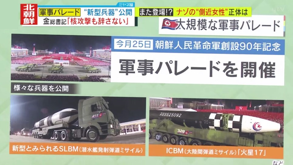 4月25日に行われた過去最大規模の軍事パレードでは、スカイダイビングや花火の打ち上げなど派手な演出と共に、新型とみられるSLBM(潜水艦発射弾道ミサイル)や、ICBM(大陸間弾道ミサイル)、「火星17」など様々な兵器が公開されました。金正恩総書記は演説で、「いかなる勢力であれ、軍事的対決を試みるのであれば、彼らは消滅する。わが国の利益を脅かすのならば核攻撃も辞さない!」と述べた上で、核・ミサイル開発を加速させる方針を強調しました。