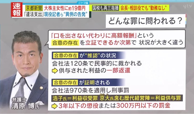 京都新聞の現役記者らが6月29日、会見を行い、自社の大株主である元相談役の女性らに対し34年間に渡り支払っていた約19億円の不正な支出を巡り、刑事告発したことを明らかにしました。なぜ報道機関の記者が自社の大株主に対し異例の刑事告発を行ったのでしょうか?今後の流れは?清原博弁護士が詳しく解説します。
