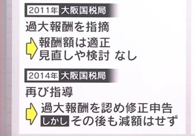 また、大阪国税局からも2011年に過大報酬を指摘されていました。その際、会社は「報酬額は適正」とし、見直しや検討はしていませんでした。2014年、再度大阪国税局から指導が入った際には過大報酬を認め、修正申告をしています。しかし翌年以降も報酬は減額されなかったということです。