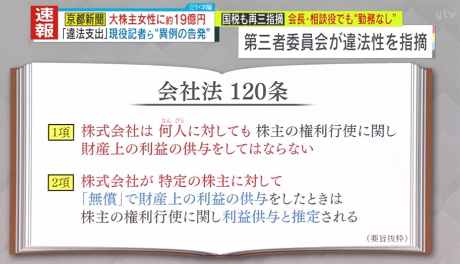 2021年6月設置された第三者委員会では、浩子氏に支払われた巨額の報酬について違法性を指摘しています。会社法120条1項では、『株式会社は何人に対しても、株主の権利行使に関し、財産上の利益の供与をしてはならない』、2項では、『株式会社が特定の株主に対して「無償」で財産上の利益の供与をしたときは、株主の権利行使に関し「利益供与」と推定される』、となっていて、浩子氏の勤務実態がないことが抵触する可能性があるということです。