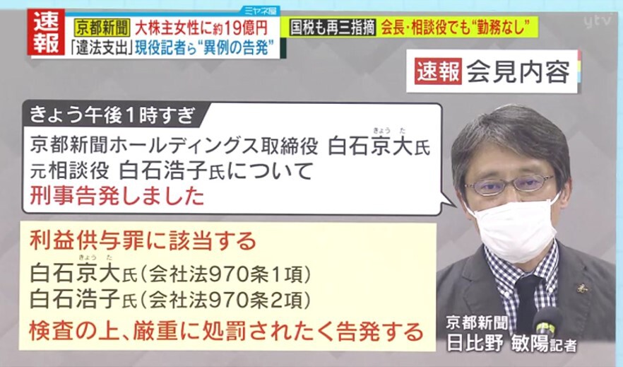 6月29日に開かれた会見で京都新聞の記者2人と弁護士は、「利益供与罪に該当する」として、「白石京大氏を会社法970条1項、元相談役・白石浩子氏を会社法970条2項について検査のうえ、厳重に処罰されたく告発する」と発表しました。会見に出席した京都新聞・日比野敏陽記者は、「(会社と)白石さんとの関係は過去から問題があり、その都度適当に伏せられてきた。その対応についておかしいと思う人が多かったがなかなか行動ができず、そういうことに失望し、仲間だった記者が辞めていったりした。誰かがこれをやらないと市民や読者に見透かされる」と話しました。