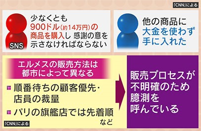 SNSでは、「少なくとも900ドル(約14万円)の商品を購入し、感謝の意を示さなければならない」という声がある一方「他の商品に大金を使わずに手に入れた」という声もあります。また、エルメスの販売方法は都市によって異なるということで、「順番待ちの顧客を優先したり、店員の裁量で販売できる」店舗もあれば、「パリの旗艦店では先着順で販売している」など販売プロセスが不明確なため憶測を呼んでいる側面もあるようです。