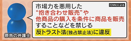 原告の弁護士は「市場力を悪用した“抱き合わせ販売”や他商品の購入を条件に商品を販売することなどを禁じる反トラスト法(独占禁止法)に違反している」と主張しています。