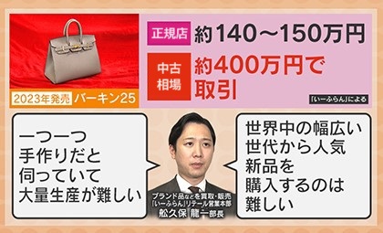 ブランド品などを買い取り・販売をする「いーふらん」によると、2023年に発売された「バーキン25」は正規店での価格が140~150万円だったのですが、現在(中古相場)は400万円で取引されているということです。「いーふらん」の舩久保龍一部長は、「ひとつひとつ手作りだと伺っていて大量生産が難しい。世界中の幅広い世代から人気で新品での購入するのは難しい」とその価格高騰の理由を話しています。