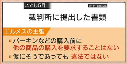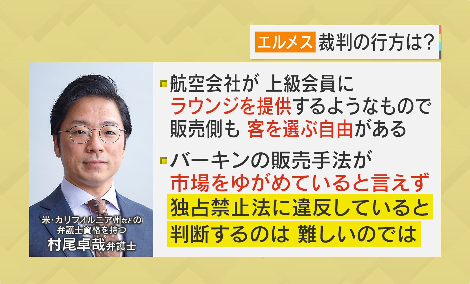 カリフォルニア州などの弁護士資格を持つ村尾卓哉氏によると「航空会社が上級会員にラウンジを提供するようなもので、販売側も客を選ぶ自由がある。バーキンの販売手法が市場をゆがめているとは言えず、独占禁止法に違反していると判断するのは難しいのでは」ということです。